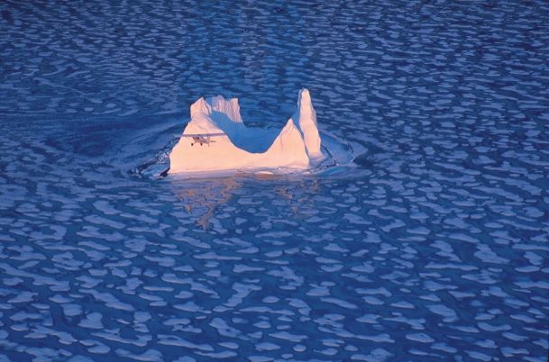Gust K (from Utah) flying past iceberg that was trapped by Broughton Island. |